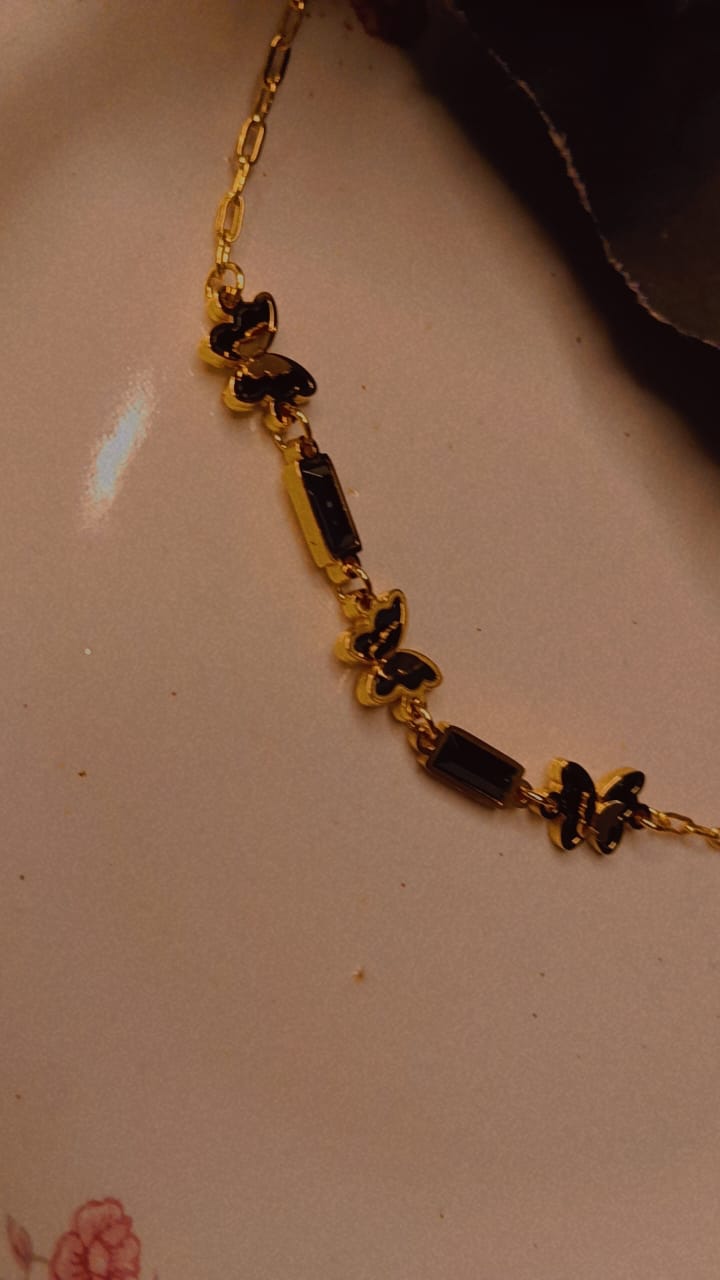 Grace meets glamour in this black butterfly charm bracelet. Featuring delicately crafted butterfly motifs paired with sleek black rectangular stones, this bracelet captures a modern yet feminine charm. The gold-plated finish adds a touch of luxury, while the lightweight and adjustable design make it comfortable for everyday wear.